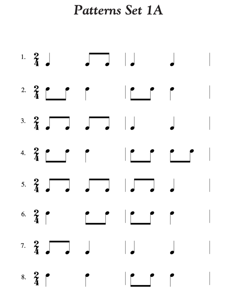 This lesson scaffolds Unit 1: Stage 3: Decode: Familiar stage of Conversational Solfege by limiting the pattern set to a single variable — the beat position of the Du-de — while keeping everything else constant. The puzzle-finding structure increases engagement and supports awareness of rhythmic organization. I have found my students struggle when initially decoding familiar patterns when presented with them played on a drum, percussion instrument or when I give a neutral syllable. By focusing initial decoding on patterns 7, 1 & 8 respectively of Pattern Set 1A it provides some constraints that I have seen unlock understanding in my students.